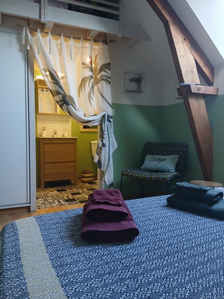 Cette chambre vous offre une ambiance décontractée aux couleurs douces et reposantes, idéale pour vous ressourcer.